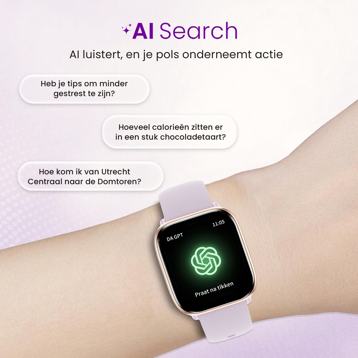 Wil je tijdens je workout of dagelijks gebruik genieten van je favoriete nummers? Verbind je telefoon via de smartwatch en controleer je muziek met één tikje op je pols. Skip nummers en bedien je afspeellijst zonder je smartphone te pakken – heerlijk praktisch en crime-proof.