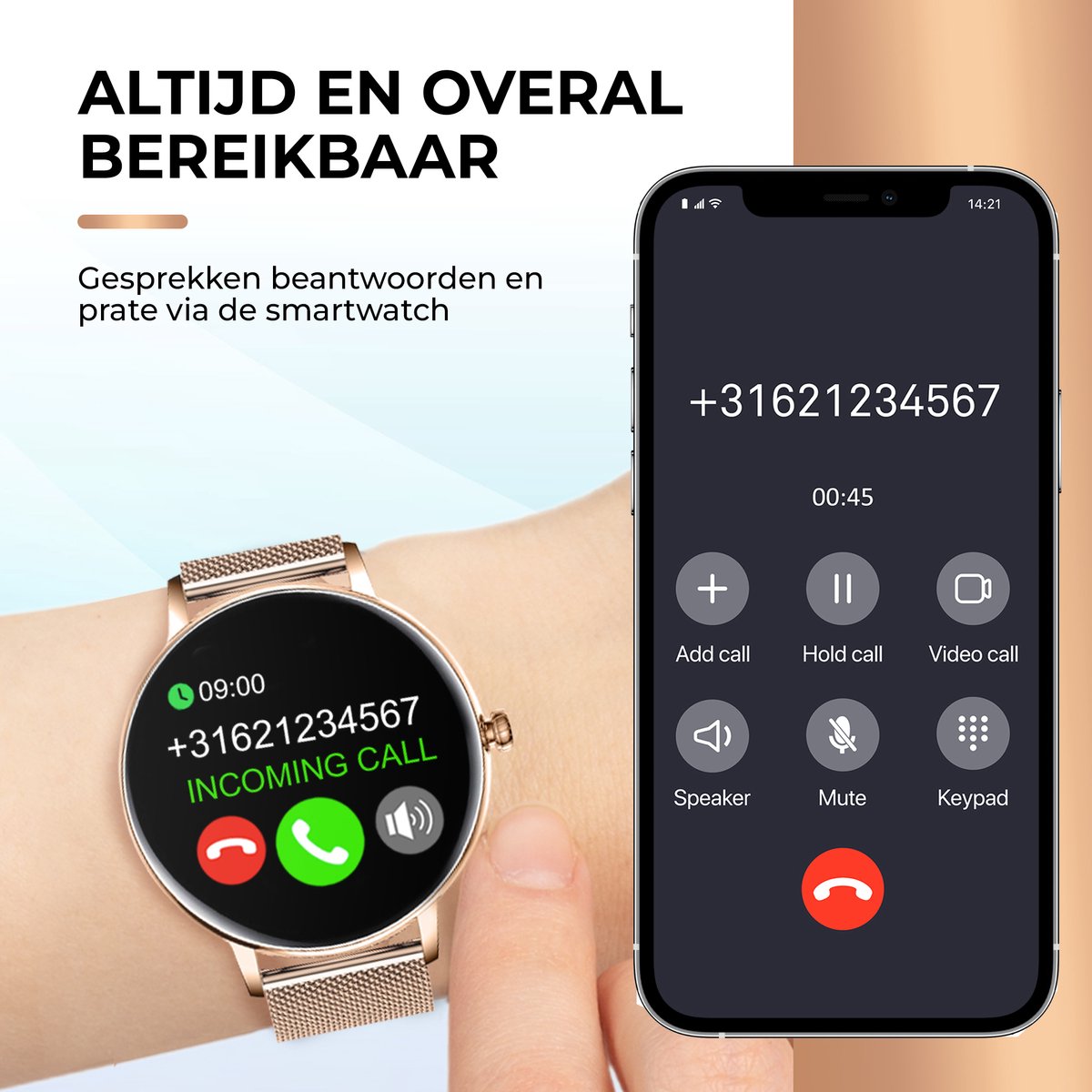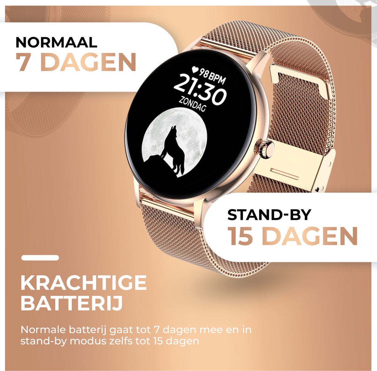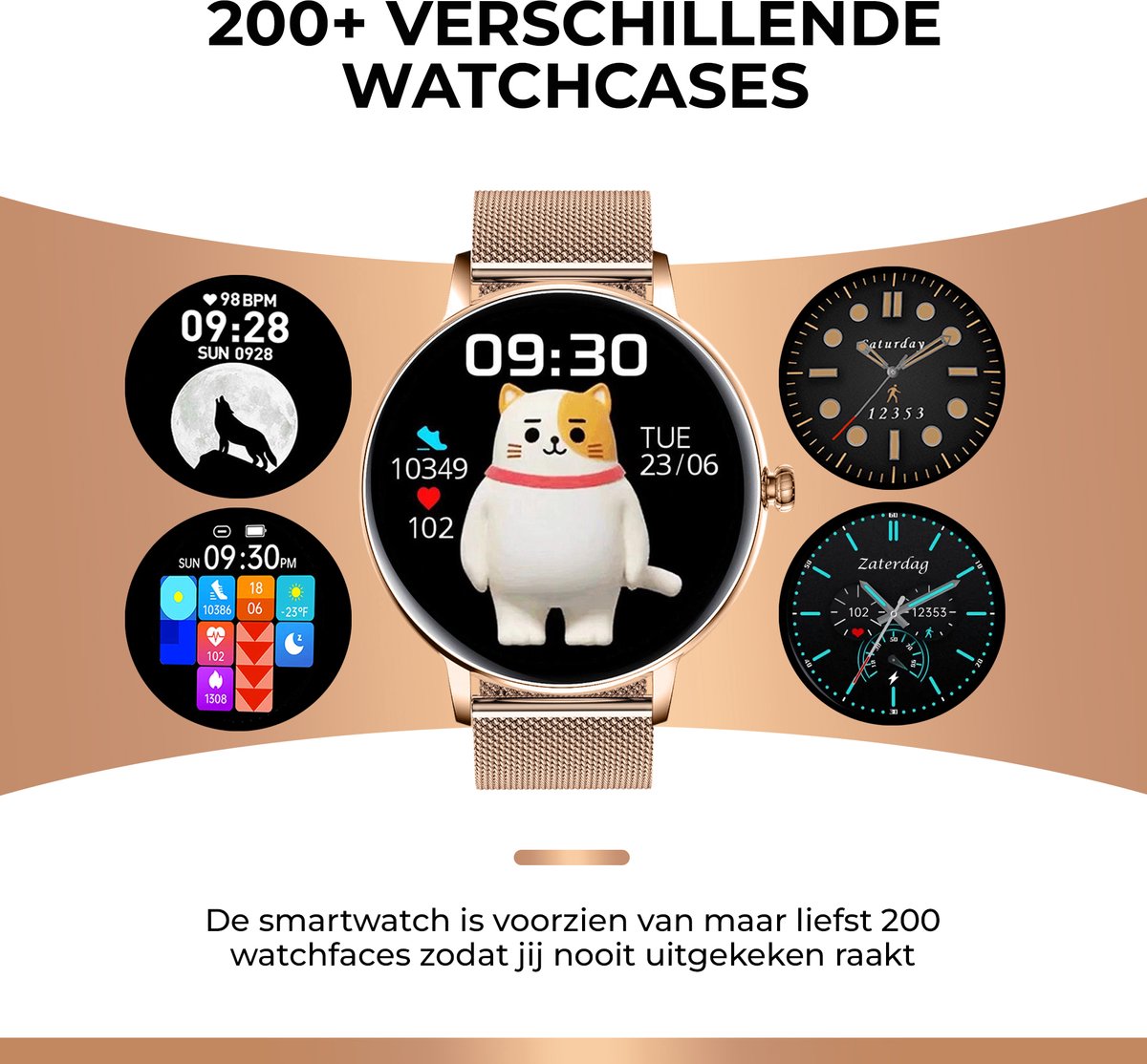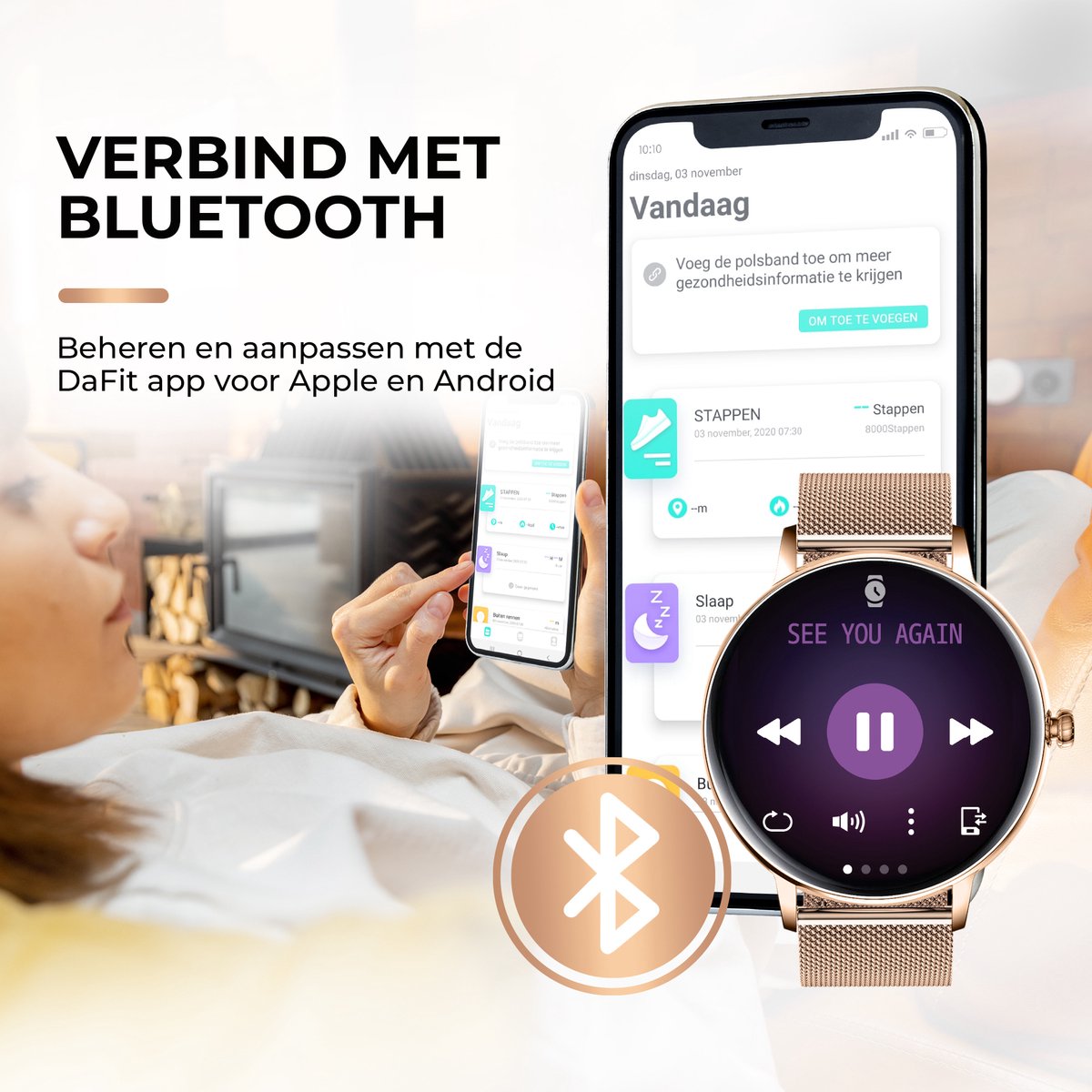 Naast je fitnesstrackers en gezondheidstools, is deze smartwatch multifunctioneel. Gebruik de stopwatch, zet herinneringen, stel een wekker in, check het weer en bedien je muziek. 's Nachts houdt het je slaap in de gaten zodat je altijd een goede nachtrust hebt. Dit alles zonder je smartphone te hoeven pakken!