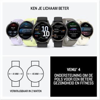 Til je dagelijks welzijn en sportprestaties naar een hoger niveau met de elegante en complete Garmin Venu 4 — stijlvol genoeg voor elke dag, krachtig genoeg voor elke training.