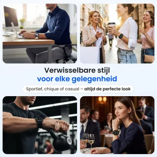De smartwatch wordt geleverd met vier verwisselbare polsbandjes, zodat je in één pakket direct kunt wisselen tussen sportief en stijlvol: