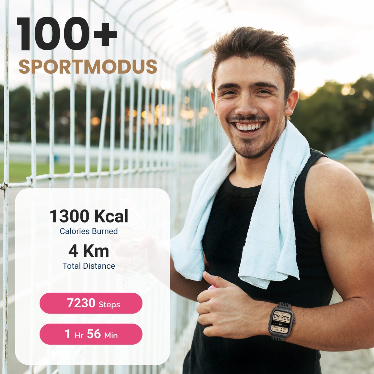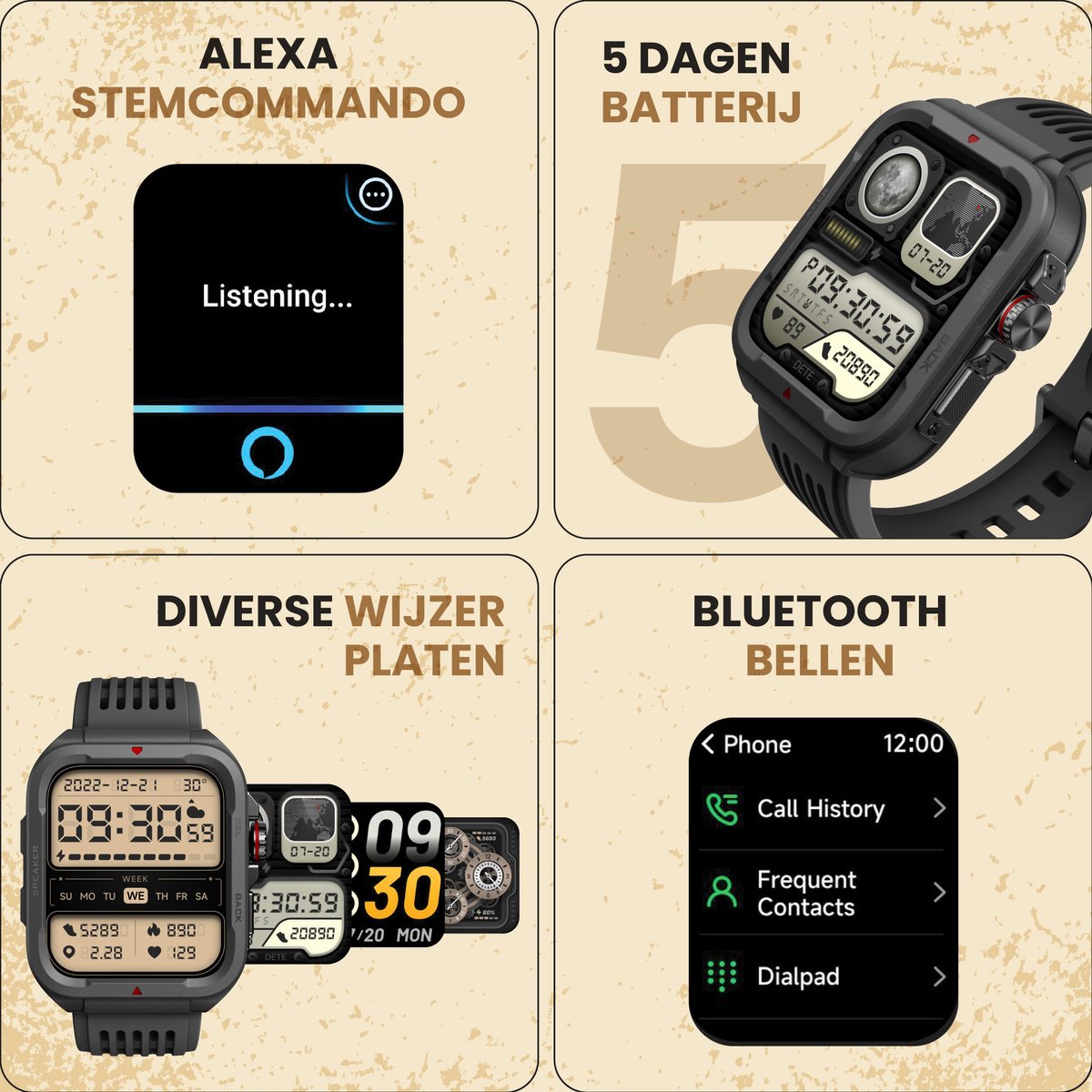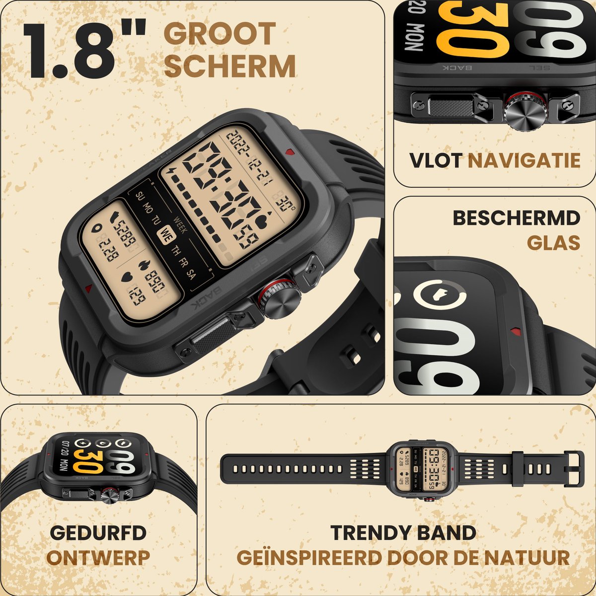 Deze smartwatch heeft meerdere militaire tests doorstaan, waaronder extreme temperaturen, stofdichtheid en lage druk. Of je nu in de kou, hitte, of in stoffige omgevingen bent, jouw horloge blijft optimaal functioneren. Het grote 1,8-inch HD-scherm met sportief design en draaibare kroon zorgt voor een scherpe, intuïtieve gebruikerservaring, ideaal voor zowel sportsessies als dagelijks gebruik.