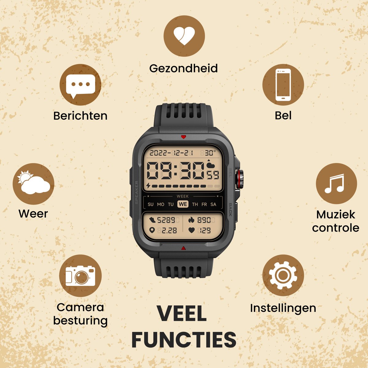 Of je nu in de natuur bent, tijdens het sporten of op je werk, de Rugged Military Smartwatch biedt jou maximale bescherming, uitgebreide gezondheidsfuncties en onafgebroken connectiviteit. Bestel vandaag nog en ervaar de ultieme combinatie van duurzaamheid, geavanceerde technologie en stijl!