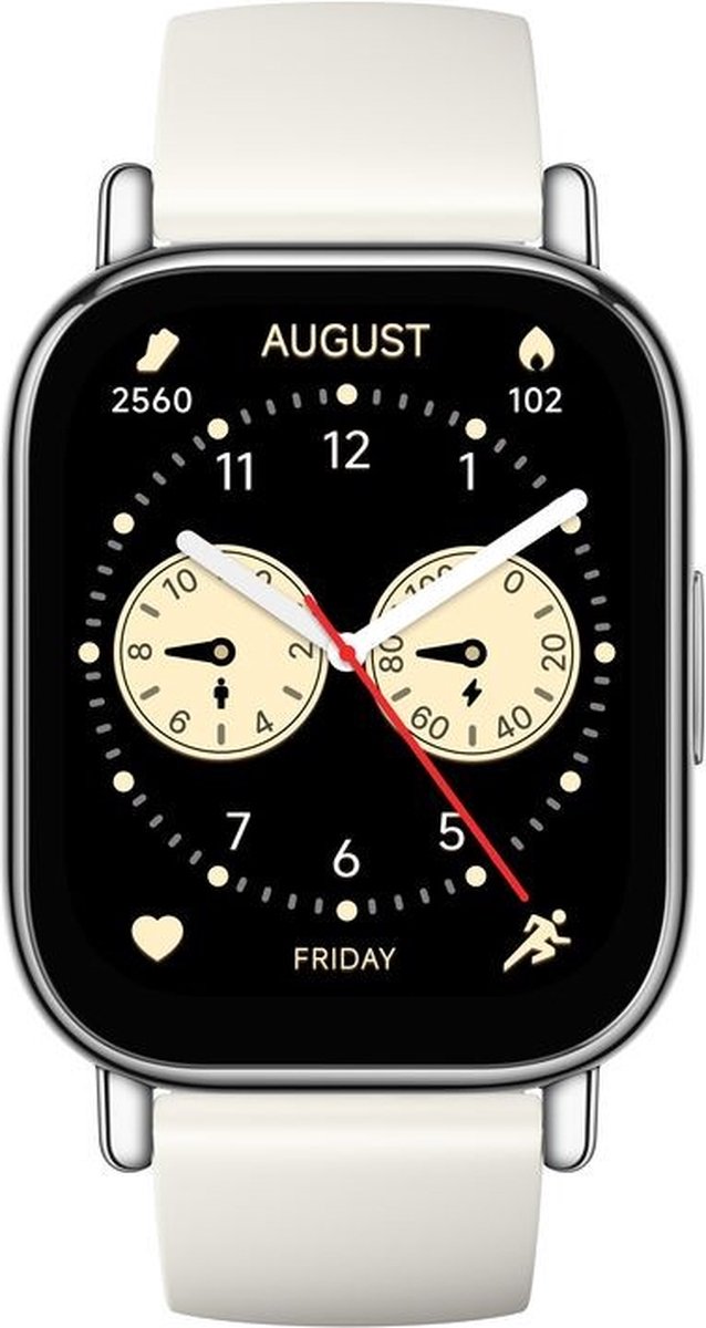 De vierkante metalen kast in zilverkleur met afgeronde hoeken krijgt een moderne uitstraling. Het lichte siliconen bandje in fris wit zorgt voor een comfortabele draagervaring, perfect voor alle dagactiviteiten en sportmomenten.